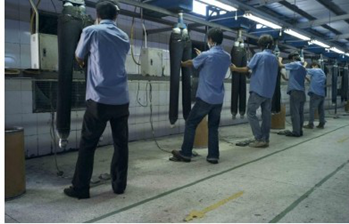 三:臭氧氧化與傳統(tǒng)方法的優(yōu)缺點(diǎn)比較 1. 用次氯酸鈉(婆梅度為18度)經(jīng)濟(jì);不好控制,有傷布的纖維。健康危害:經(jīng)常用手接觸本品的工人,手掌大量出汗,指甲變薄,毛發(fā)脫落。本品有致敏作用。本品放出的氯氣有可能引起中毒。具腐蝕性,可致人體灼傷,具致敏性。 2. 用亞氯酸鈉和硫酸在加次氯酸鈉。價(jià)格比上一種高點(diǎn)。但比上一種好點(diǎn)。不傷布的纖維。亞氯酸鈉有強(qiáng)氧化性。在175℃時(shí)即分解而發(fā)熱,與可燃物質(zhì)接觸,即起猛烈爆炸,須注意安全。硫酸對(duì)環(huán)境有危害,對(duì)水體和土壤可造成酸性污染。具強(qiáng)腐蝕性、強(qiáng)刺激性,可致人體灼傷。 3. 高錳酸鉀、過醋酸和還原漂白方式 關(guān)于牛仔布漂白,除了用次氯酸鈉和亞氯酸鈉外,還可以用高錳酸鉀、過醋酸和還原漂白方式,具體需要根據(jù)牛仔布所用染料類型來選擇,傳統(tǒng)牛仔為還原淀籃染料,也有用硫化染料或直接染料代替,也有采用活性染料代替的,故此,需要根據(jù)具體情況考慮。 4. 臭氧氧化的優(yōu)點(diǎn) a) 無污染,臭氧為純凈物。在常溫下,易分解,生成氧氣和氧原子 b) 臭氧的氧化能力極強(qiáng)。 c) 運(yùn)行成本低 四:手工處理 1.手擦 a) 在洗水前,通過使用砂輪滾動(dòng)摩擦而使布面染料褪色,手擦的地方通常是脾位和臀位,人為的機(jī)械褪色,讓牛褲在洗水后顯得自然地懷舊和泛白 b) 噴沙和手擦效果接近,但對(duì)布紋的效果有差別。噴沙后布紋模糊,沉底,而手擦后布紋清晰凸顯