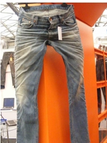 3.磨邊 磨爛 勾紗 將衣物在洗水前,人為地將褲腳,褲頭等一些特定部位用銳器刮爛,從而制成洗后的破爛懷舊效果